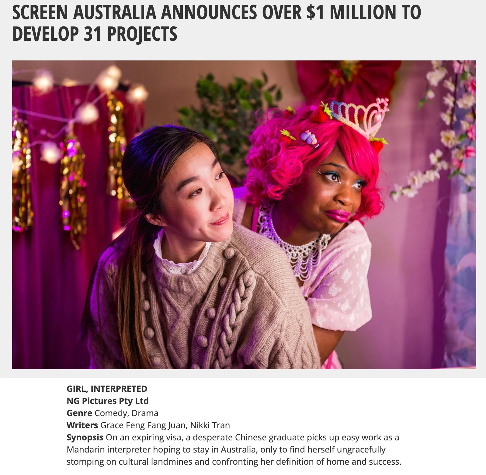 Girl, Interpreted receives funding for half-hour Read the full Screen Australia media release GIRL, INTERPRETEDNikki Tran13 April 2022girl interpreted, tv series, grace feng fang juan, jenny zhou, Nikki Tran, web series, screen australia, development funding Facebook0 Twitter LinkedIn0 Reddit Tumblr 0 Likes